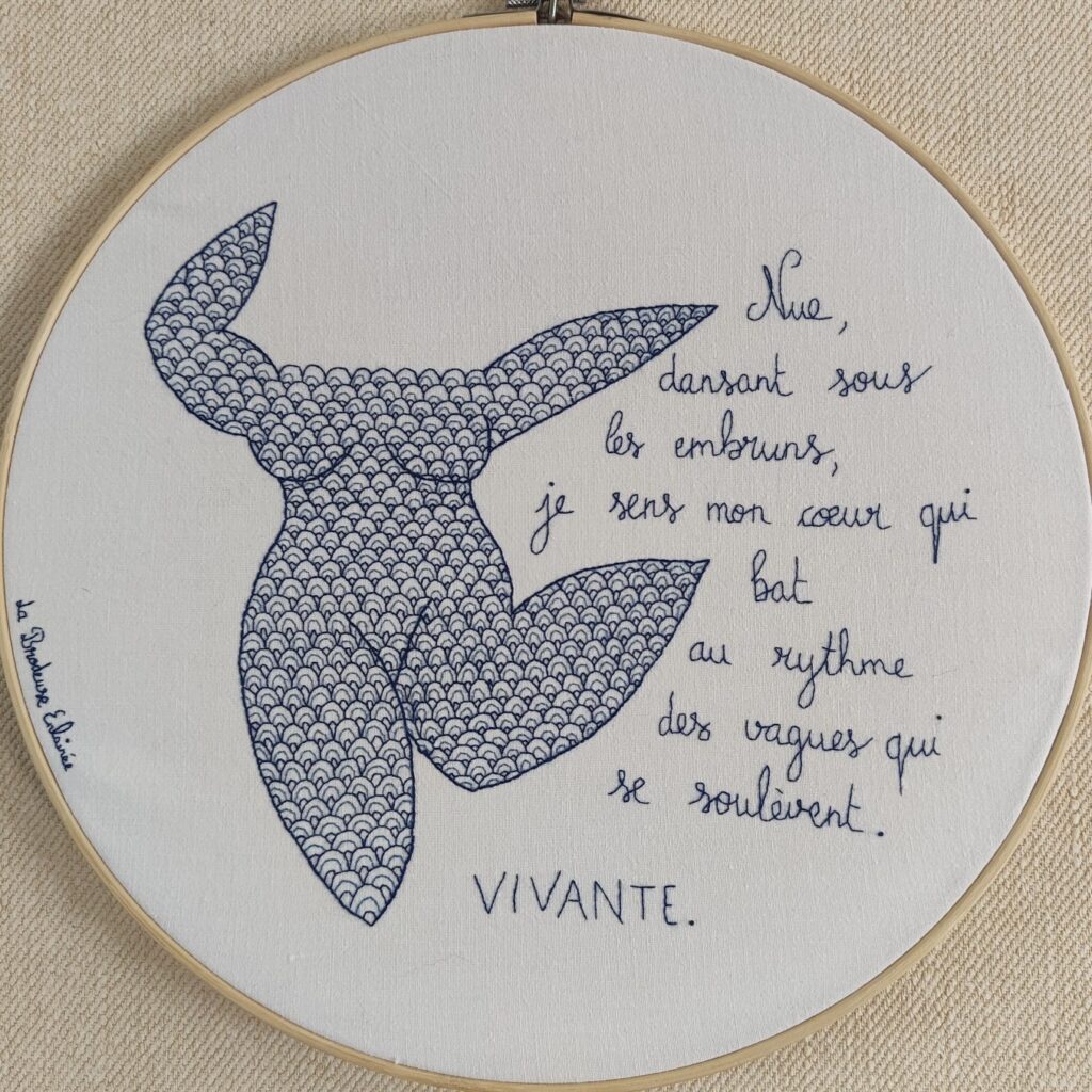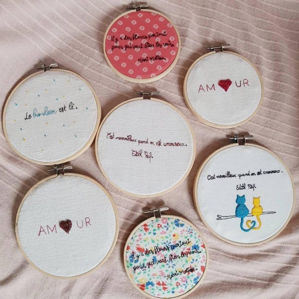 Chaque phrase, chaque mot, chaque lettre même constituant ces mots sont le résultat d’un geste manuel et répétitif, d’une multitude de points, de va et vient de mon aiguille à travers le tissu, telle une danse lancinante.