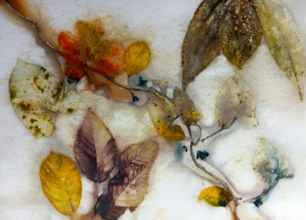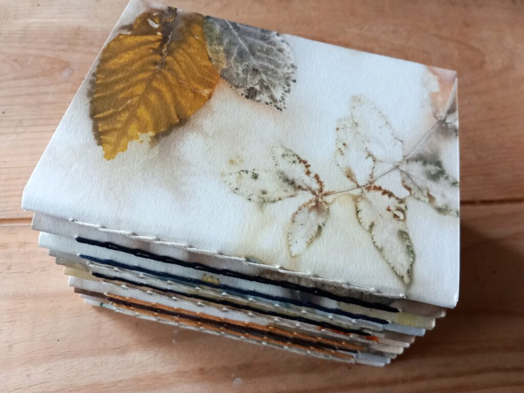 Créations papetières à base de plantes à fibres et de plantes « à couleur », sauvages ou cultivées : empreintes tinctoriales sur papier, papiers végétaux ou recyclés, carnets, cartes, herbiers et différents objets en papier.